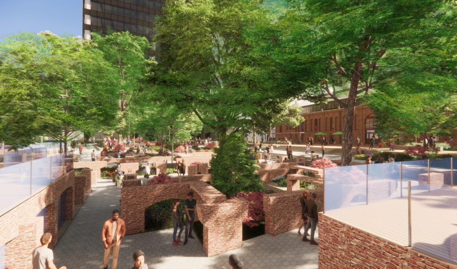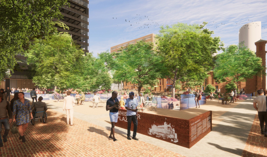 ”We imagine the west plaza to be rich in character with the exposed brick columns and vaulted archways and limestone of the historic catacombs with new stone paving and seating, garden planting and a space that is full of life from the new residential building with opportunities for lunch and dinner, drinks and family gatherings spilling out from the city market,” Designer Chris Merritt said.