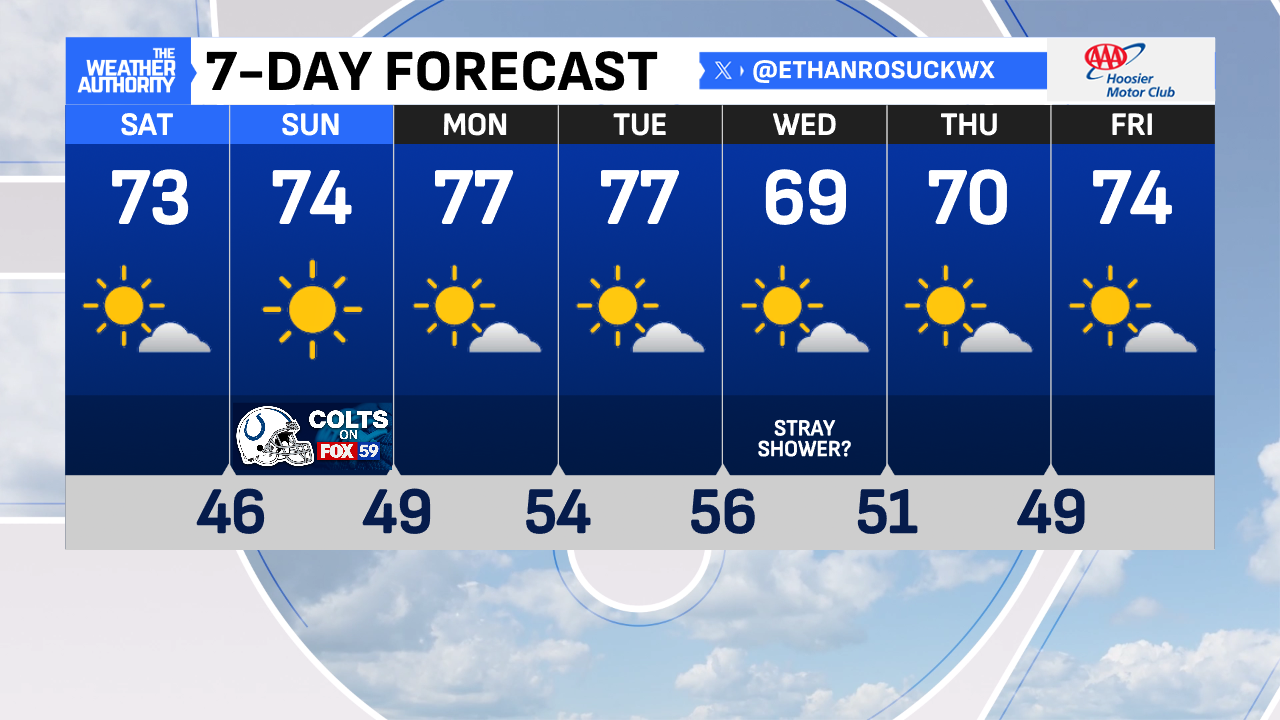 High temperatures on Saturday will be in the low to mid-70s across Central Indiana. The same can be said for Sunday as well. The Indianapolis Colts will be back at Lucas Oil Stadium for a 1:00 p.m. game. This go-around, both the roof and window will be open!