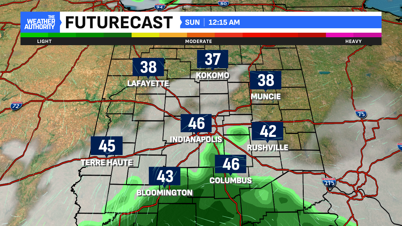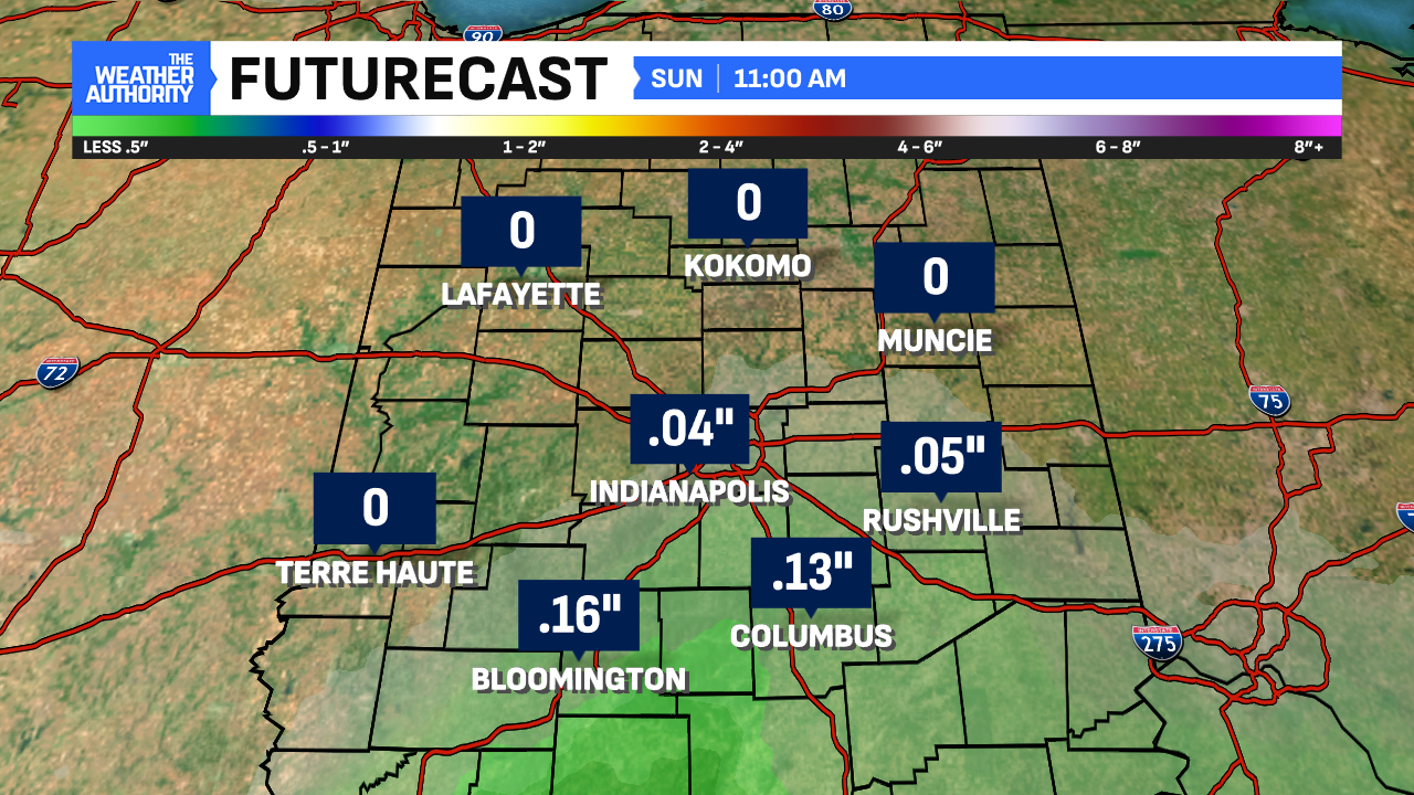 A weak system today passes just to our south. Most of us will stay dry. But keep an eye out if you’re in our counties south of I-70. It’s those spots where the most persistent, light rain showers look to be. Timing on this will be late tonight and into very early Sunday. Amounts look to be light, generally under a quarter of an inch.
