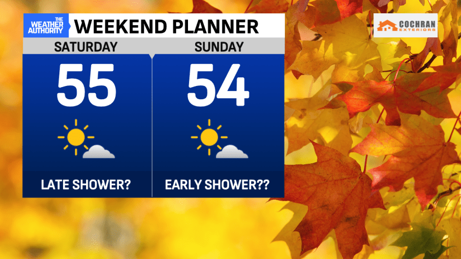 Expect seasobably cooler temperatures both Saturday and Sunday. Forecast highs in the mid-to-low 50s are a few degrees below average. We will remain dry, for the most part, minus a rain chance very late Saturday.