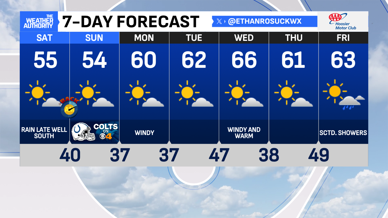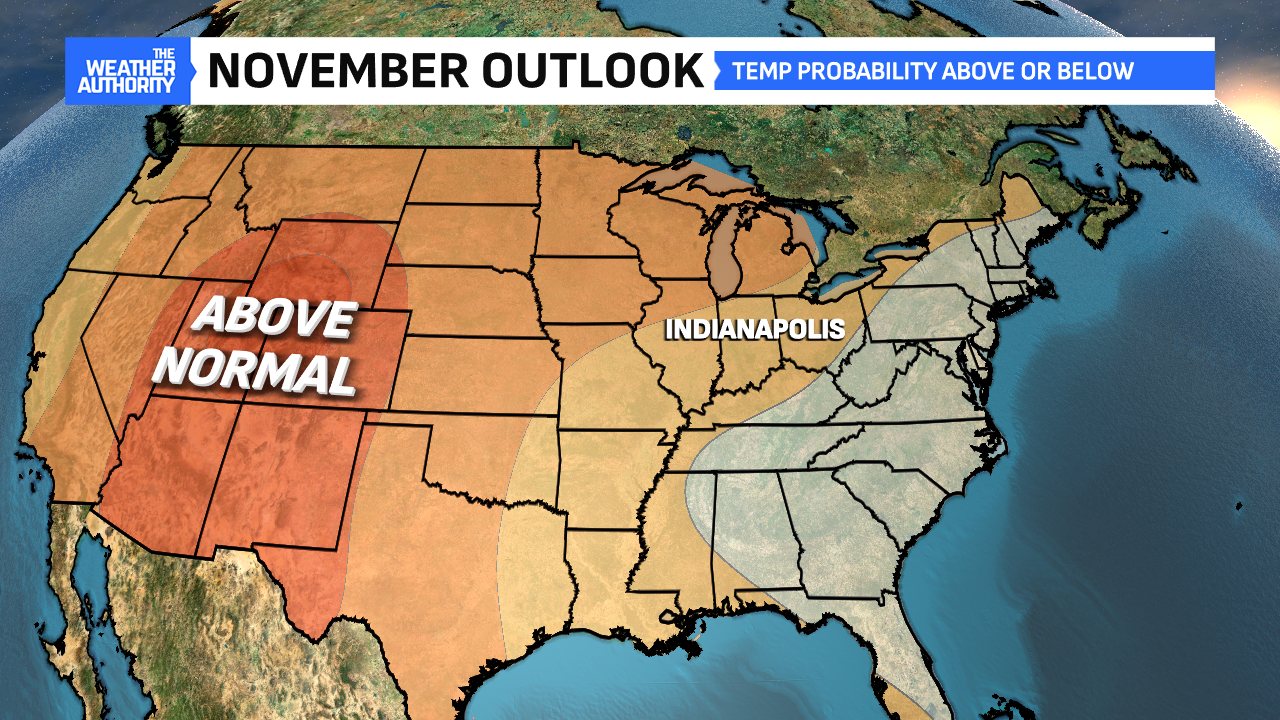 The first full week of November looks dry. It’ll also be a week filled with mainly sunny skies, breezy conditions and a gradual mild trend. By Wednesday, central Indiana will feel more like October with highs in the mid-to-upper 60s. Those are numbers nearly ten degrees above normal for this time of the year!