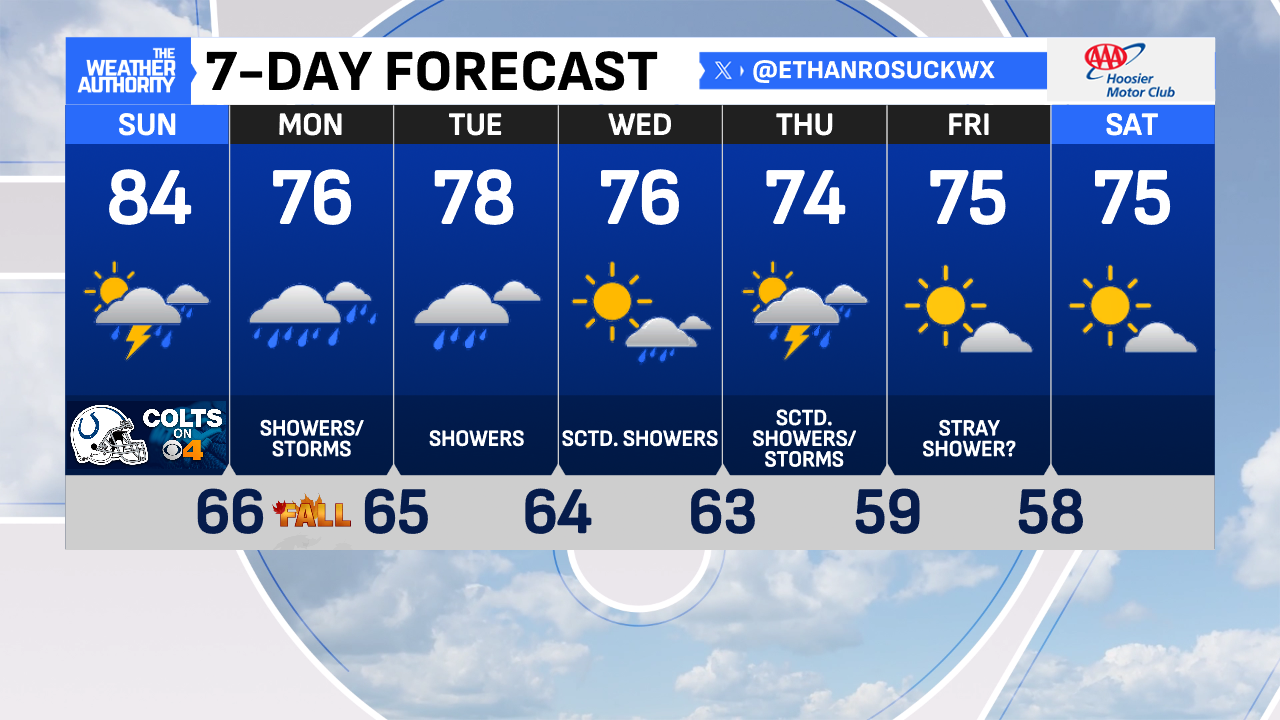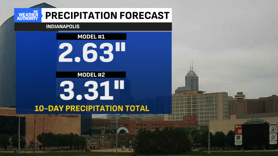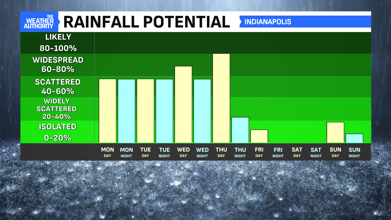 This week in a nutshell for Central Indiana… (1) A Daily Rain Chance (2) Muggier Dew Points and (3) Slightly Lower Temperatures. All in all, lawns and trees will be happy this week. 2-3″+ of rainfall potential exists for portions of central Indiana. Luckily, our grassy surfaces for the most part can handle this due to the lack of rain! This will HOPEFULLY put a solid dent in our drought.
