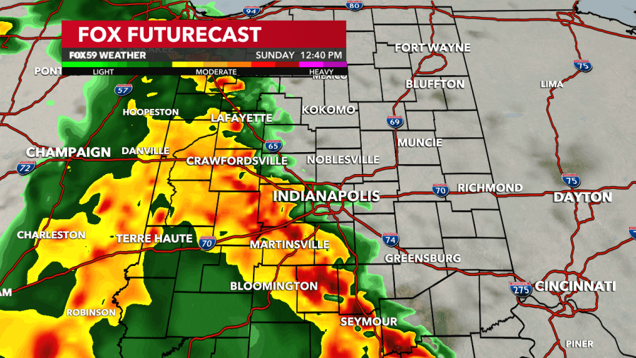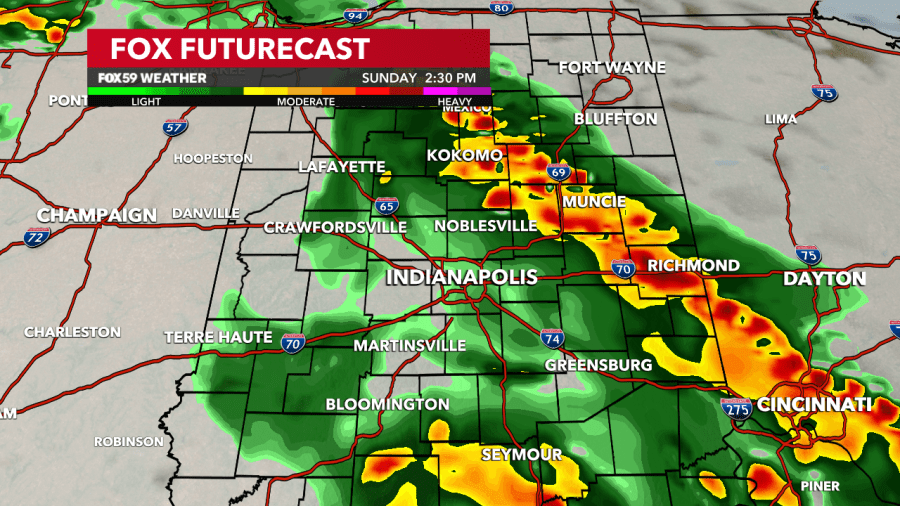 How this round plays out will depend on how quickly the first round moves out and how much clearing we see. At this time, areas just south and west of Indianapolis have a slight uptick in severe potential should these storms develop. This will all come ahead of a cold front. See the Futurecast imagery below.