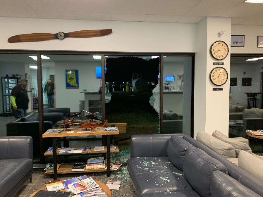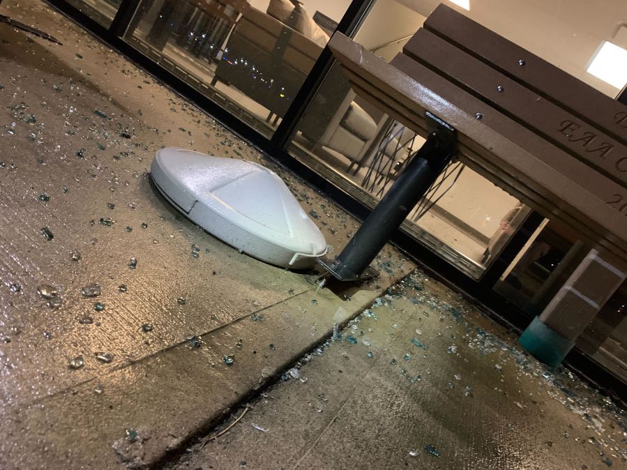 During the storm, a light pole fell on a car, although no one was hurt. Debris from the storm was strewn around the outside of the building and the parking lot.